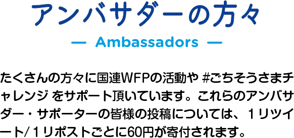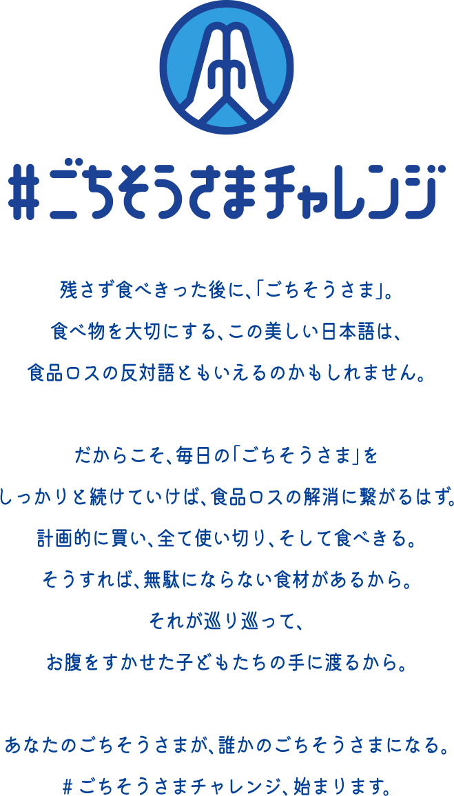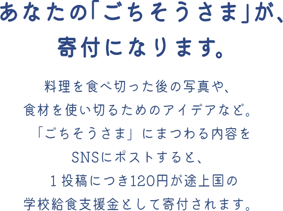 あなたの「ごちそうさま」が、寄付になります。 料理を食べ切った後の写真や、食材を使い切るためのアイデアなど。「ごちそうさま」にまつわる内容をSNSにポストすると、1投稿につき120円が途上国の学校給食支援金として寄付されます。