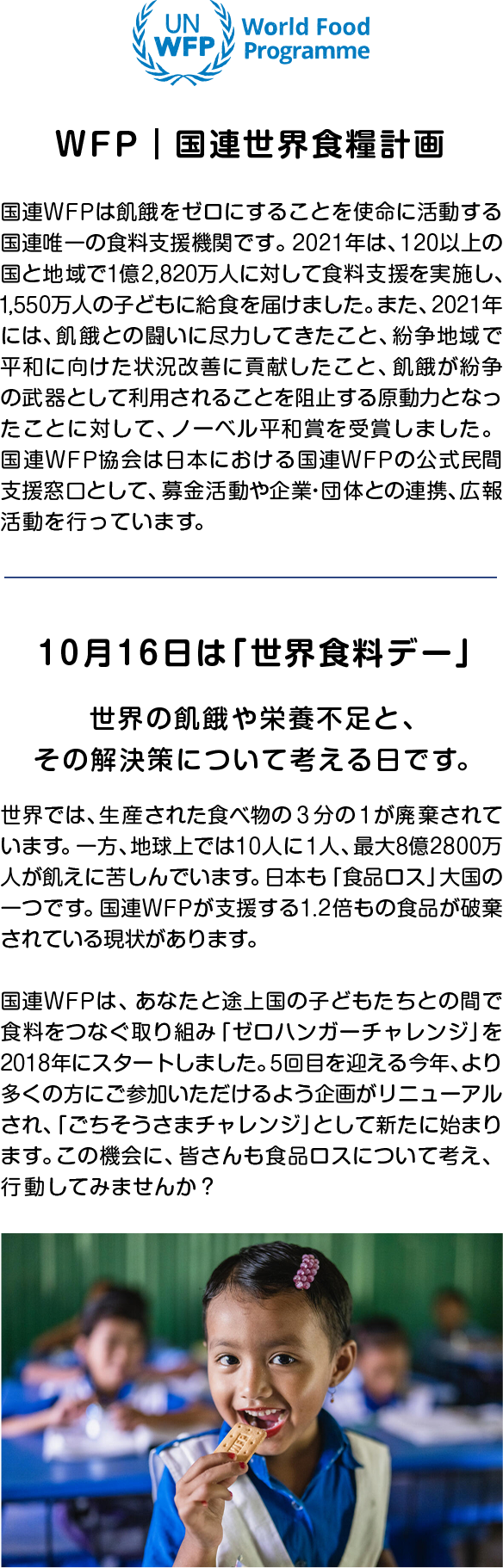 国連WFPは飢餓をゼロにすることを使命に活動する国連唯一の食料支援機関です。2021年は、120以上の国と地域で1億2,820万人に対して食料支援を実施し、1,550万人の子どもに給食を届けました。また、2021年には、飢餓との闘いに尽力してきたこと、紛争地域で平和に向けた状況改善に貢献したこと、飢餓が紛争の武器として利用されることを阻止する原動力となったことに対して、ノーベル平和賞を受賞しました。国連WFP協会は日本における国連WFPの公式民間支援窓口として、募金活動や企業・団体との連携、広報活動を行っています。