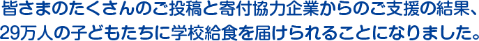 皆さまのたくさんのご投稿と寄付協力企業からのご支援の結果、 29万人の子どもたちに学校給食を届けられることになりました。
