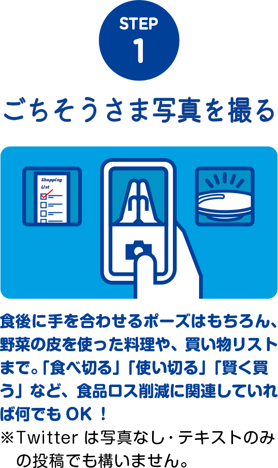 食後に手を合わせるポーズはもちろん、野菜の皮を使った料理や、買い物リストまで。 「食べ切る」「使い切る」「賢く買う」など、食品ロス削減に関連していれば何でもOK! ※Twitterは写真なし・テキストのみの投稿でも構いません。