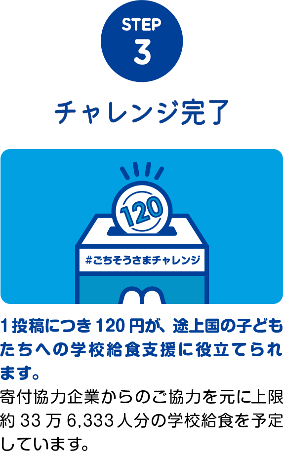 1投稿につき120円が、途上国の子どもたちへの学校給食支援に役立てられます。